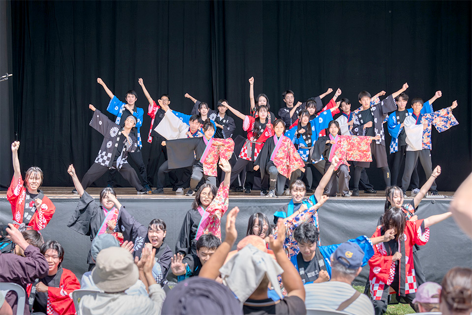 ステージ上およびその前方の広いスペースを活用し、迫力あるパフォーマンスを披露しました。IPUのソーラン華チームの学生が振付およびパフォーマンス指導を担当し、約30名の大人数チームをまとめ上げてくれました。